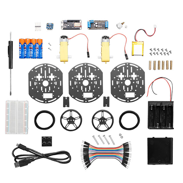 Συμπεριλαμβανόμενα συμβούλια MCU / MPU Adafruit Feather 32u4 Bluefruit LE Περιεχόμενα Board(s), Chassis, Components, Hardware, Motor(s), Wheel(s)