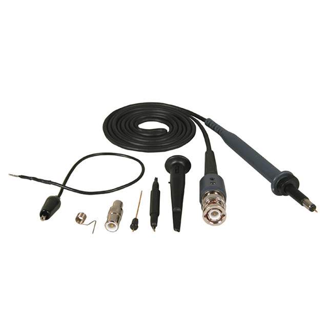 περιλαμβάνει BNC Adapter, Ground Lead, Insulating Tip, Sprung Hook, Rings, Trimmer Tool Λεπτομερής περιγραφή 10:1 Passive 500MHz 47.244" (1200.00mm) Black Oscilloscope Probe Test Lead 10M Input Resistance CAT II 300V